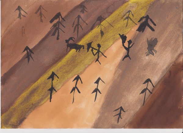 Na tomto obrazu se odehrává lov na mamuta. Žena přikládá do ohně a muž s tlupou pravěkých lidí se chystá na lov. Mamut jí trávu a lovců si nevšímá. Smečka se blíží k mamutovi a podaří se jim ho ulovit. Na druhý den se opékal, byly mamutí hody. Bohužel při lovu zemřel náčelníkův syn, lidé vykopali díru a přikryli ho mamutím stehnem. Z kostí si udělali zbraně na další lov. Žena náčelníka pro syna pořád brečela, ale za měsíc se jí narodila dcera Hamuta, to zmírnilo její žal.
