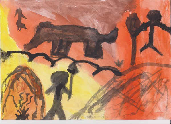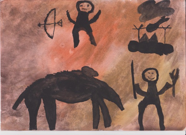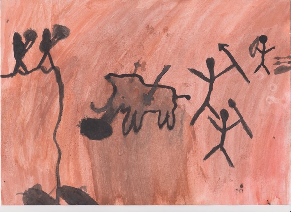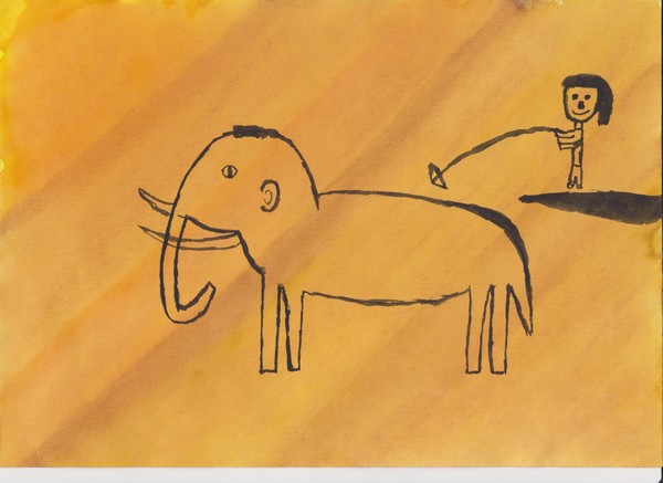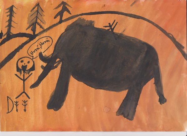Jednoho dne jsem se vzbudil a moji sourozenci mi řekli: „Bratře! Pojď s námi. Dnes je den, na který jsme tak moc těšili!“ Já jsem řekl: „Jupí, první lov mamuta!“ Šli jsme se nasnídat a pak jsme se šli vybavit. Rodiče řekli: „Pojďte, ale nebuďte hluční, nebo nás mamut uslyší!“ Sestra zpozorovala mládě mamuta a řekla: „Mami, tati, dívejte se! Je támhle!“ Šli jsme ho pozorovat. Tatínek řekl: „Ale ne! Je zraněné! Musíme být opatrní, jestli tu není matka!“ Rozhodli jsme se zaútočit. Všichni řekli: „Hurá, lov byl úspěšný!“ Šli jsme domů a já jsem namaloval obrázek v mém jeskynním pokojíčku. Navečeřeli jsme se a šli spát.