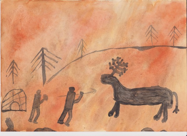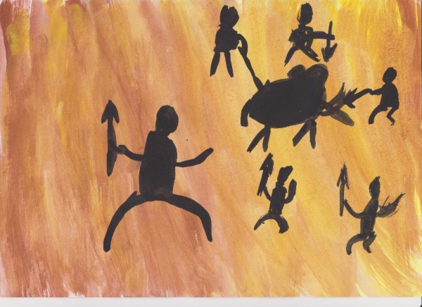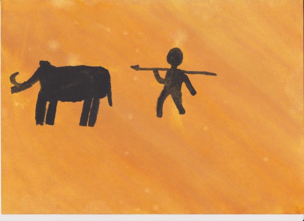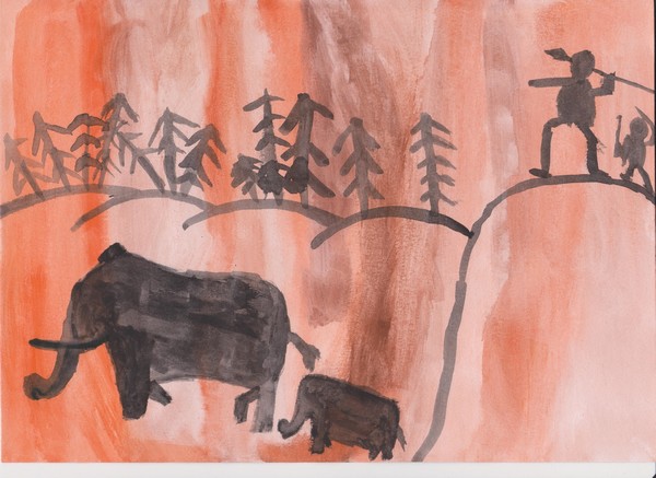 Jednoho dne jsme šli na lov a potkali jsme mamuta. Rychle jsme ho nahnali ke skále a můj bratr ho trefil do hlavy šípem, protože byl nejlepší lukostřelec v tlupě. A náčelník ho trefil kopím do těla. Potom dva muži z naší tlupy vystoupili na skálu a začali po něm házet velké kameny. První kámen ho trefil do chobotu. Mamut se snažil svůj chobot vytáhnout, ale marně, furt po něm házeli kameny a kopí, až mamut utonul. Tak jsme ho vzali a nesli jsme ho k jeskyni Šipce. Snědli jsme ho, kosti jsme si nechali na zbraně, bohužel naší tetě umřelo šestileté dítě, protože padlo z jeskyně, tak jsme ho pohřbili na místě, dali jsme k němu kly a pohřbili jsme ho. Honza