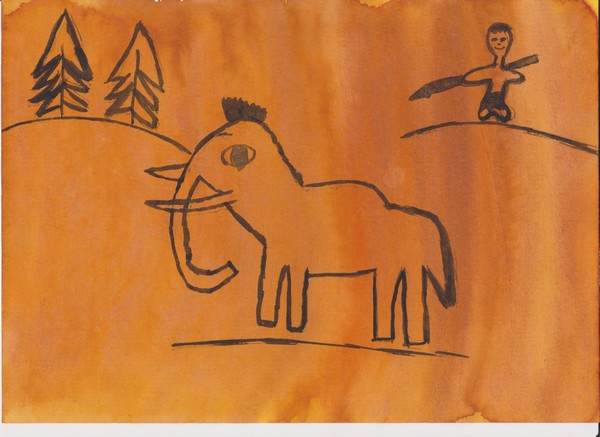 Jednoho dne jsem se rozhodl, že sám skolím mamuta. Vzal jsem si s sebou oštěp a šel jsem hledat. Šel jsem lesem, hledal jsem a mamut nikde. Vyšel jsem už z lesa, zaslechl jsem něco a pomalu jsem se k tomu plížil, koukl jsem se a konečně jsem viděl mamuta. Pomalu jsem k němu šel, vzal jsem oštěp, rozběhl jsem se a udeřil jsem ho, konečně jsem ho skolil. Simona