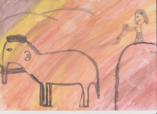 Ve čtvrtek jsem šla spát a v pátek jsem se probudila v pravěku a řekla jsem si: „Kde to jsem?“ Byla jsem v pravěku! Bylo tam mnoho lidí a já mezi nimi, bála jsem se, že mi něco udělají, ale byli ke mně milí, jako by už mě znali. Ten den šli muži lovit, já jsem je poprosila, jestli můžu jít s nimi. Přemýšleli a pak řekli, že můžu. Poprvé jsem viděla mamuty. Vyšli jsme na kopec a náčelník začal střílet. Mamuti utíkali a utíkali. Jeden mamut však zůstal stát a toho náčelník využil. Několikrát mamuta střelil a mamut se skácel k zemi. Bylo mi ho docela líto, ale měla jsem hlad. Nejsilnější muži dotáhli mamuta k jeskyni. A pak mamuta rozřezali a maso opekli na ohni, mamut byl moc dobrý. Nejvíc vtipné na tom bylo, jak se divili mému pyžamu. Ještěže jsme ve čtvrtek měli dějepis a o pravěku jsem věděla vše, co jsem potřebovala. Po tomhle dni budu v dějepise nejlepší. Katka M.